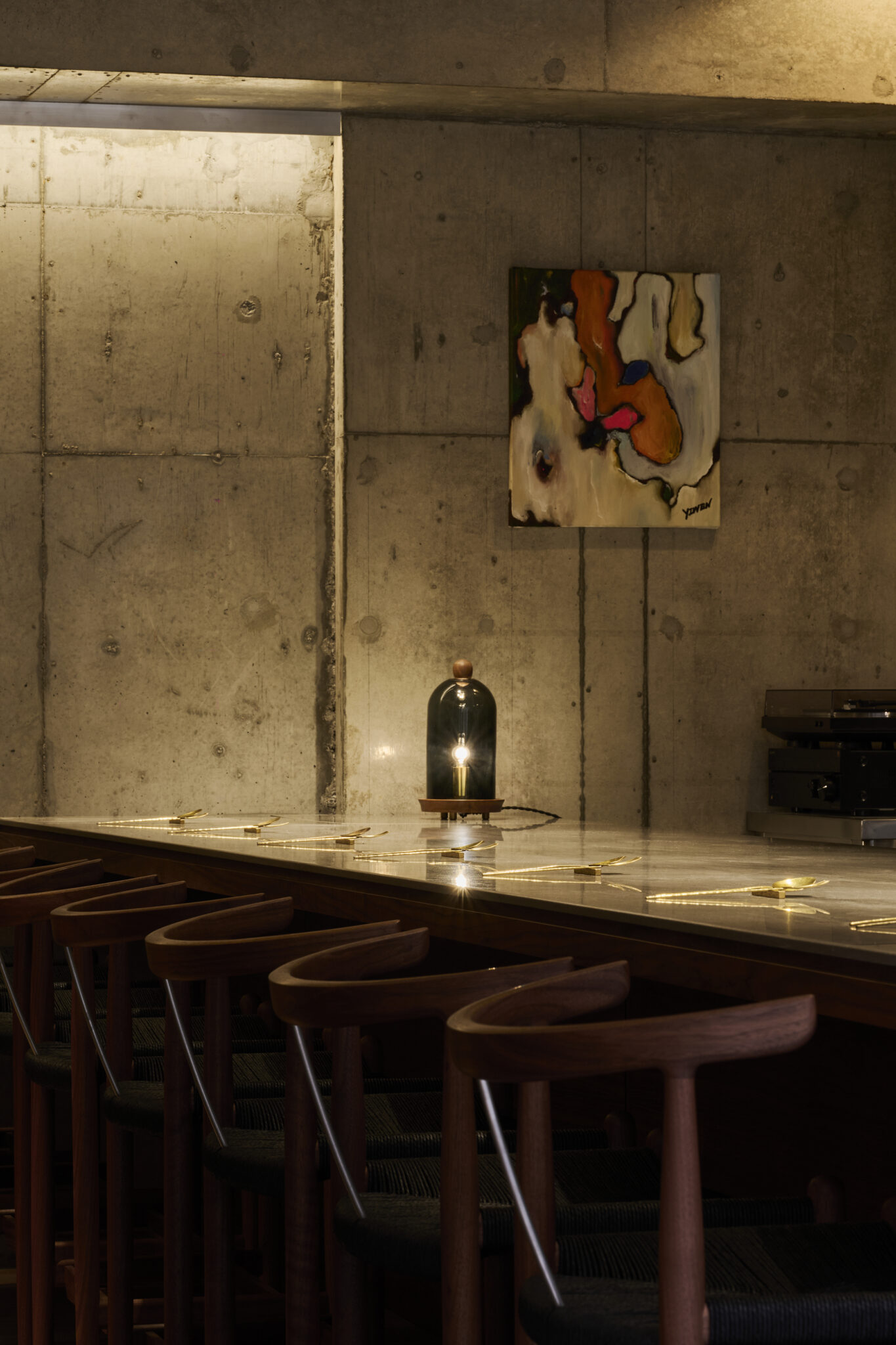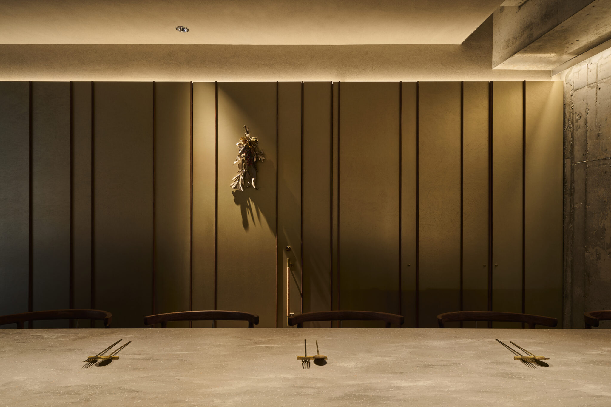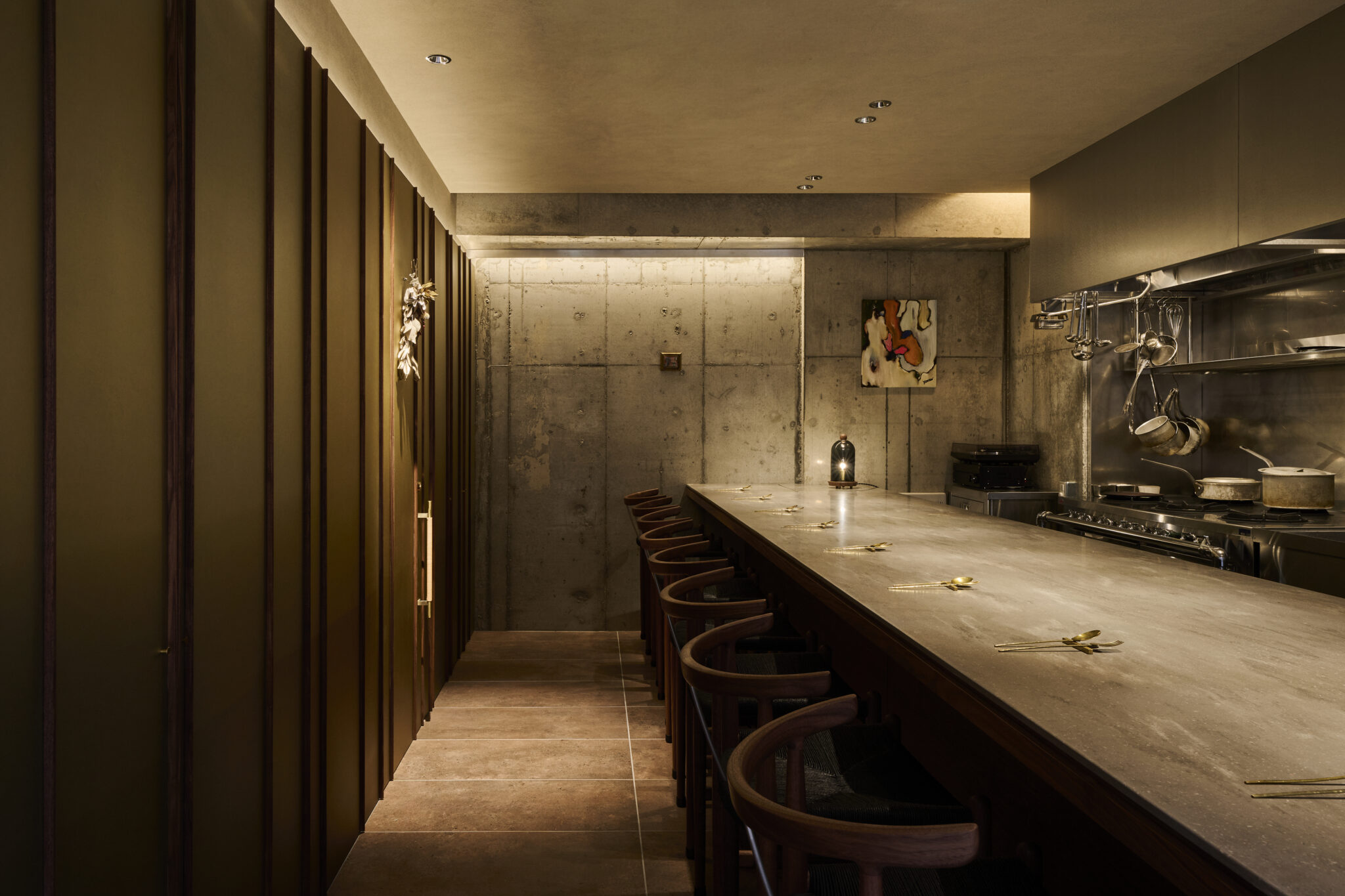 店内カウンターはシェフの所作をライブで楽しめる大きなchef’s tableとし、8席のゲストは一体感を持って時を共有する。