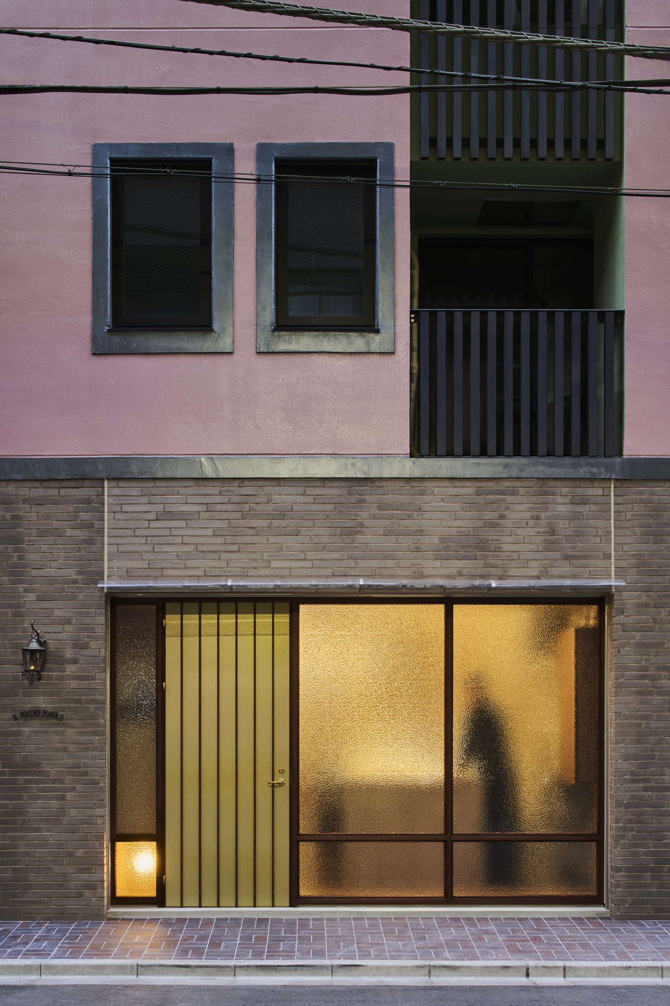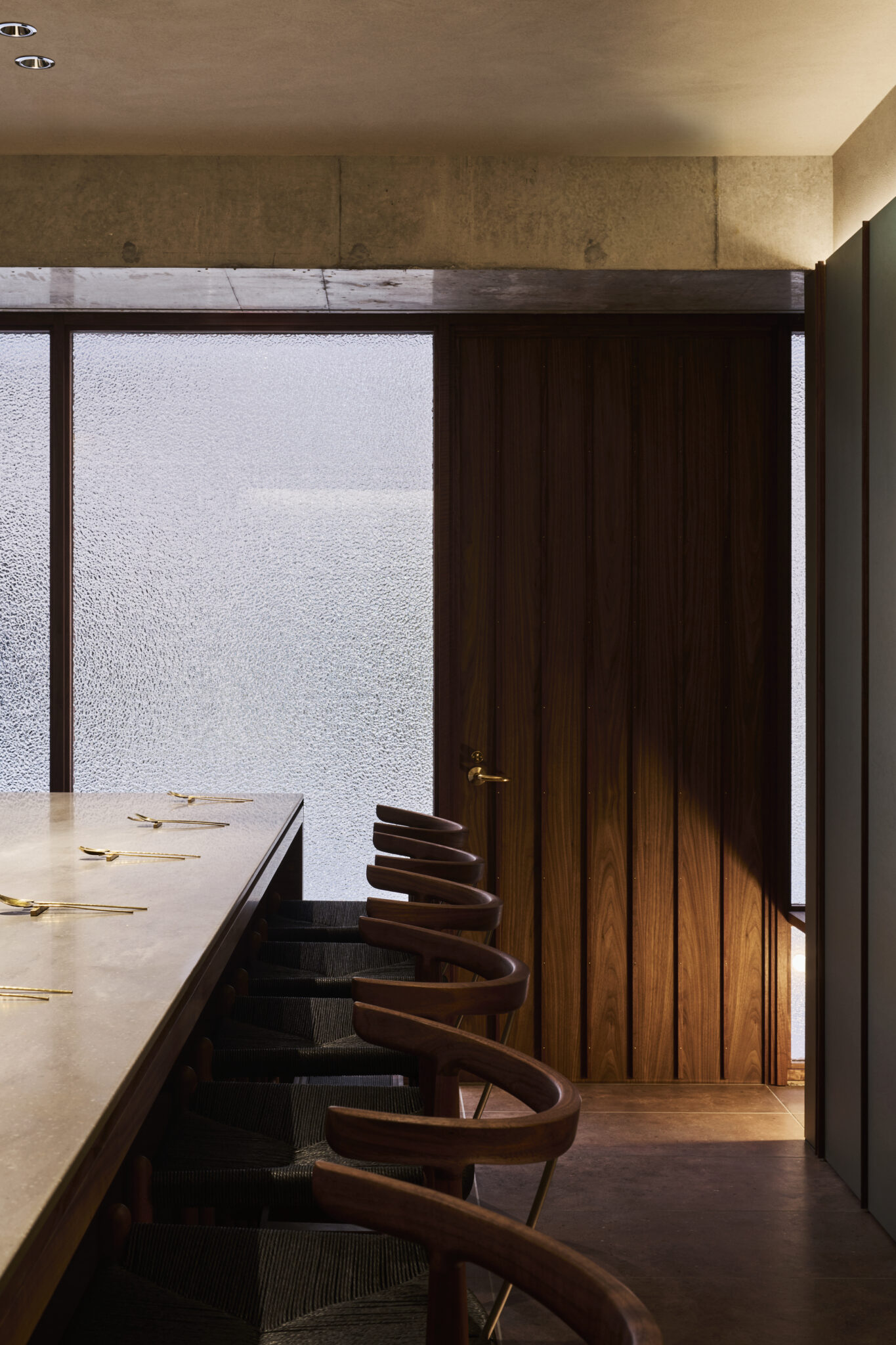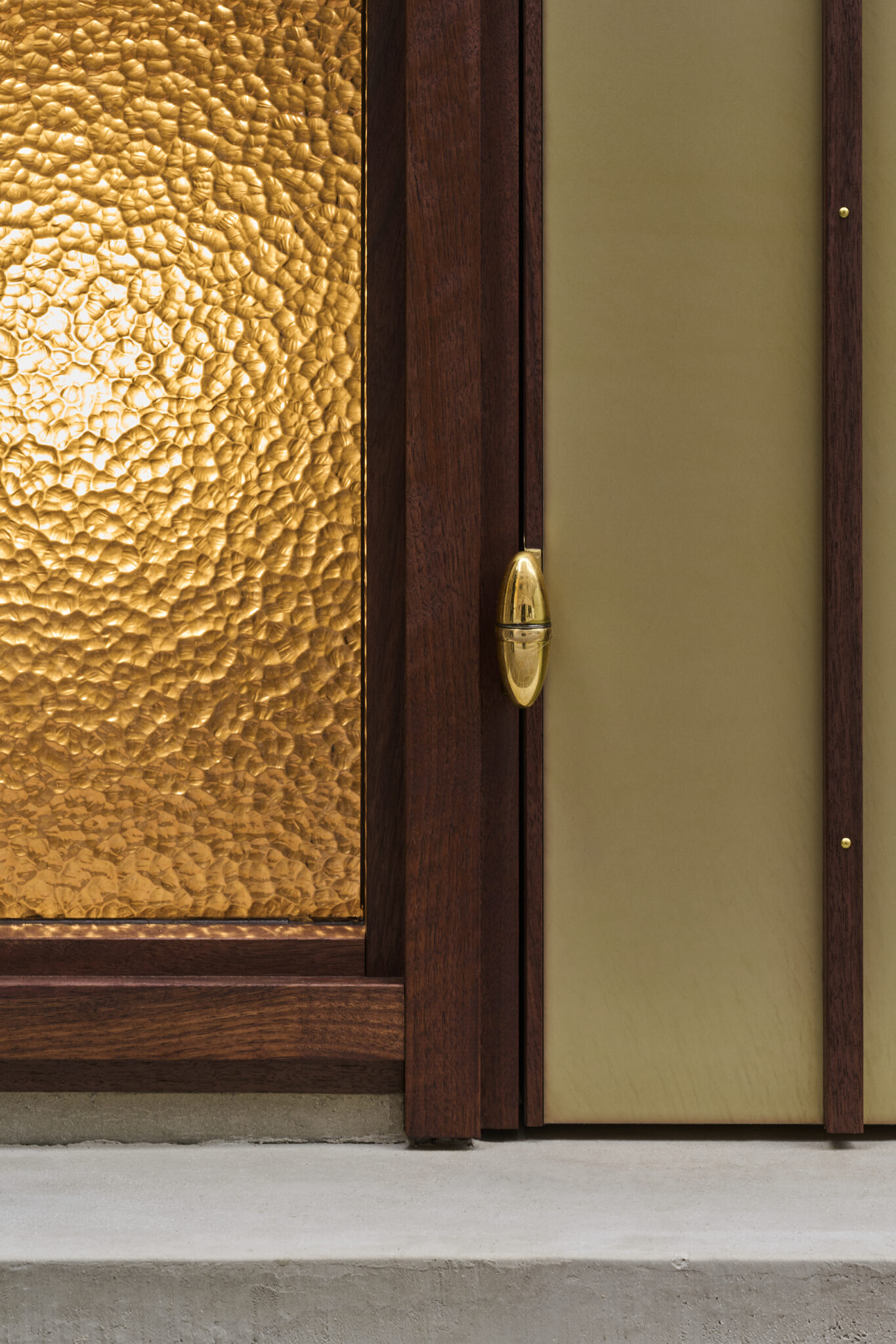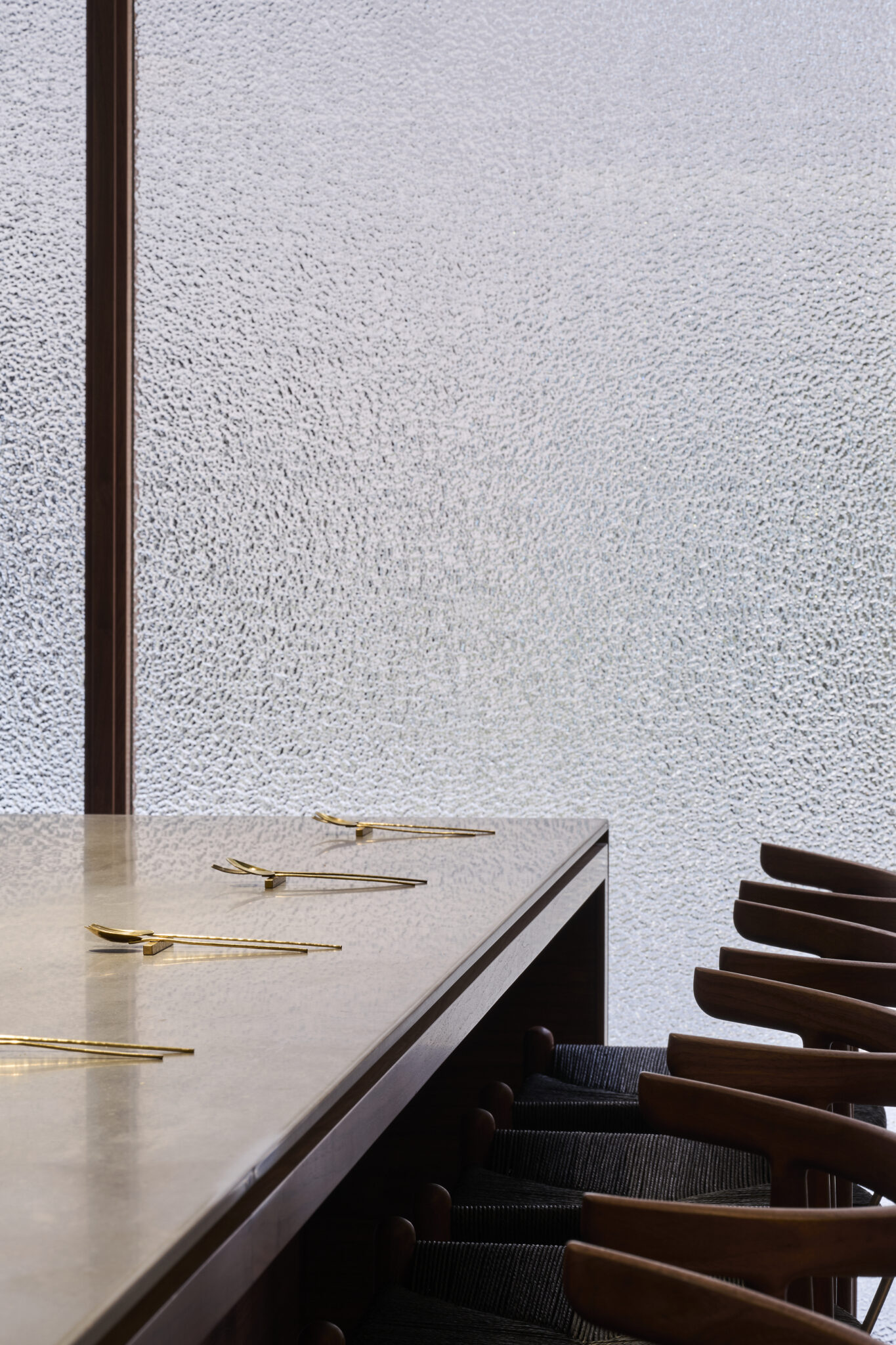 ウォルナットの木枠に嵌めたフランスの型板ガラスによって内部の光は乱反射しながら外へと拡散し、同時に、そこに映るシェフとゲストの振る舞いも動きのあるシルエットとして街に届ける。