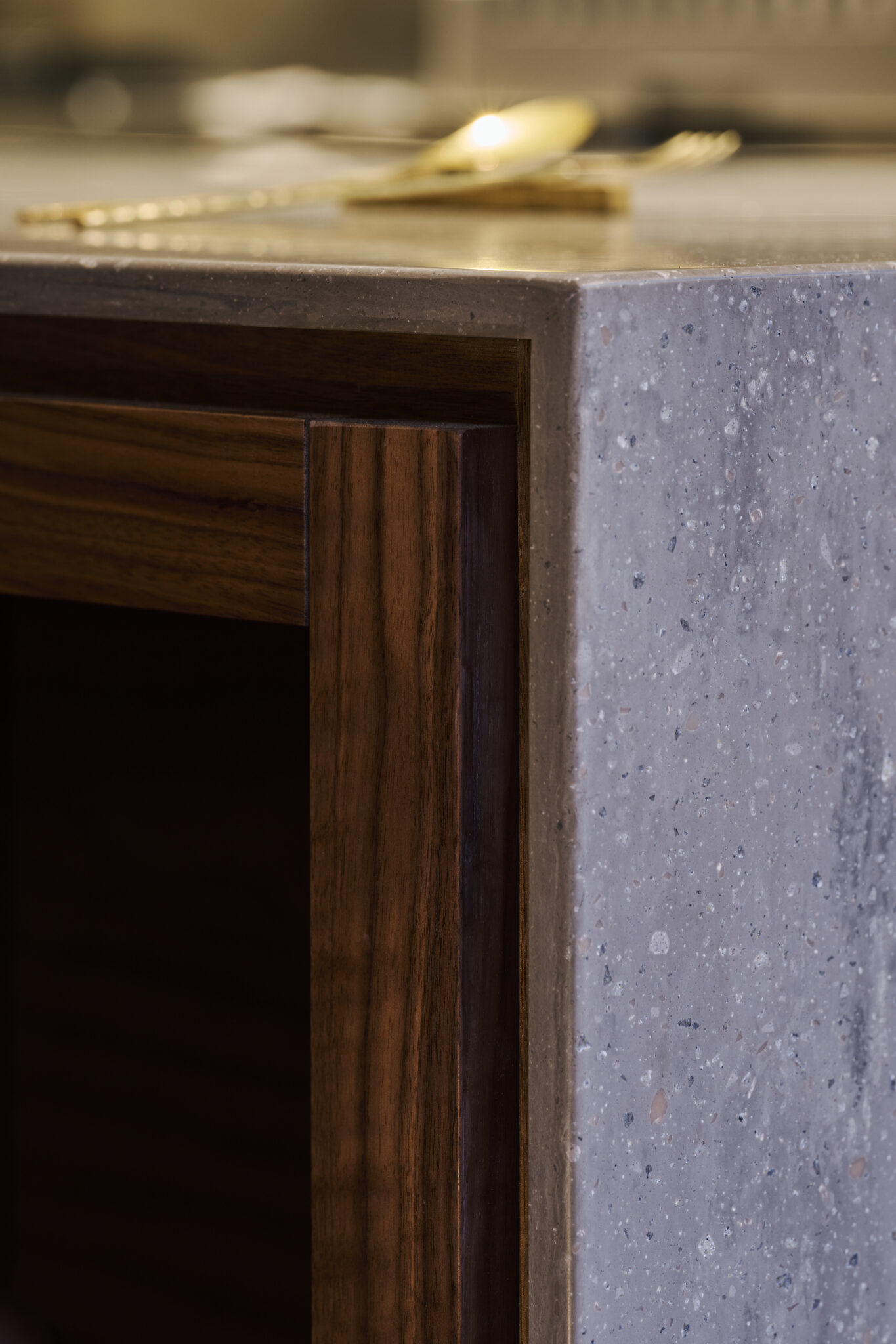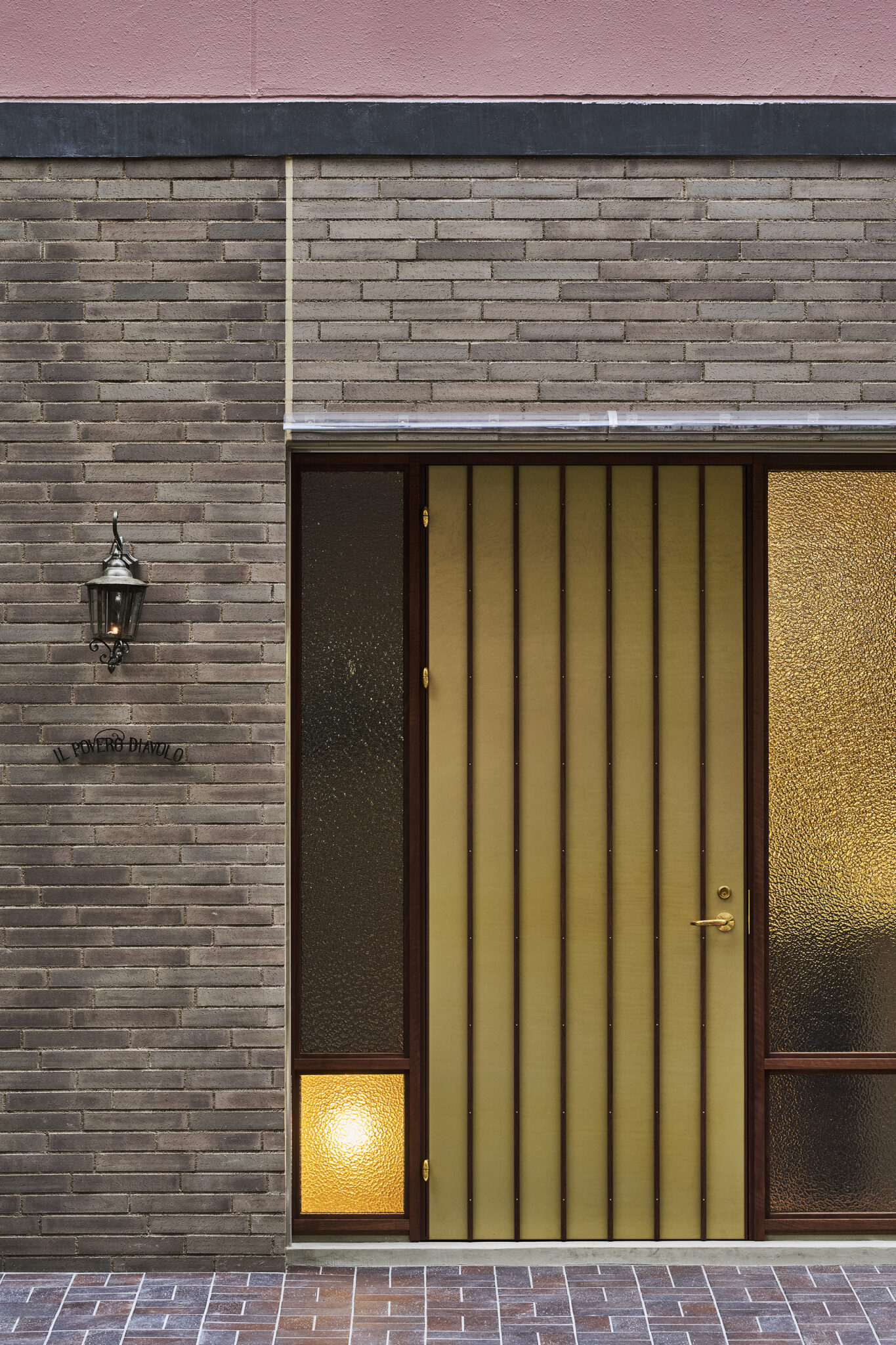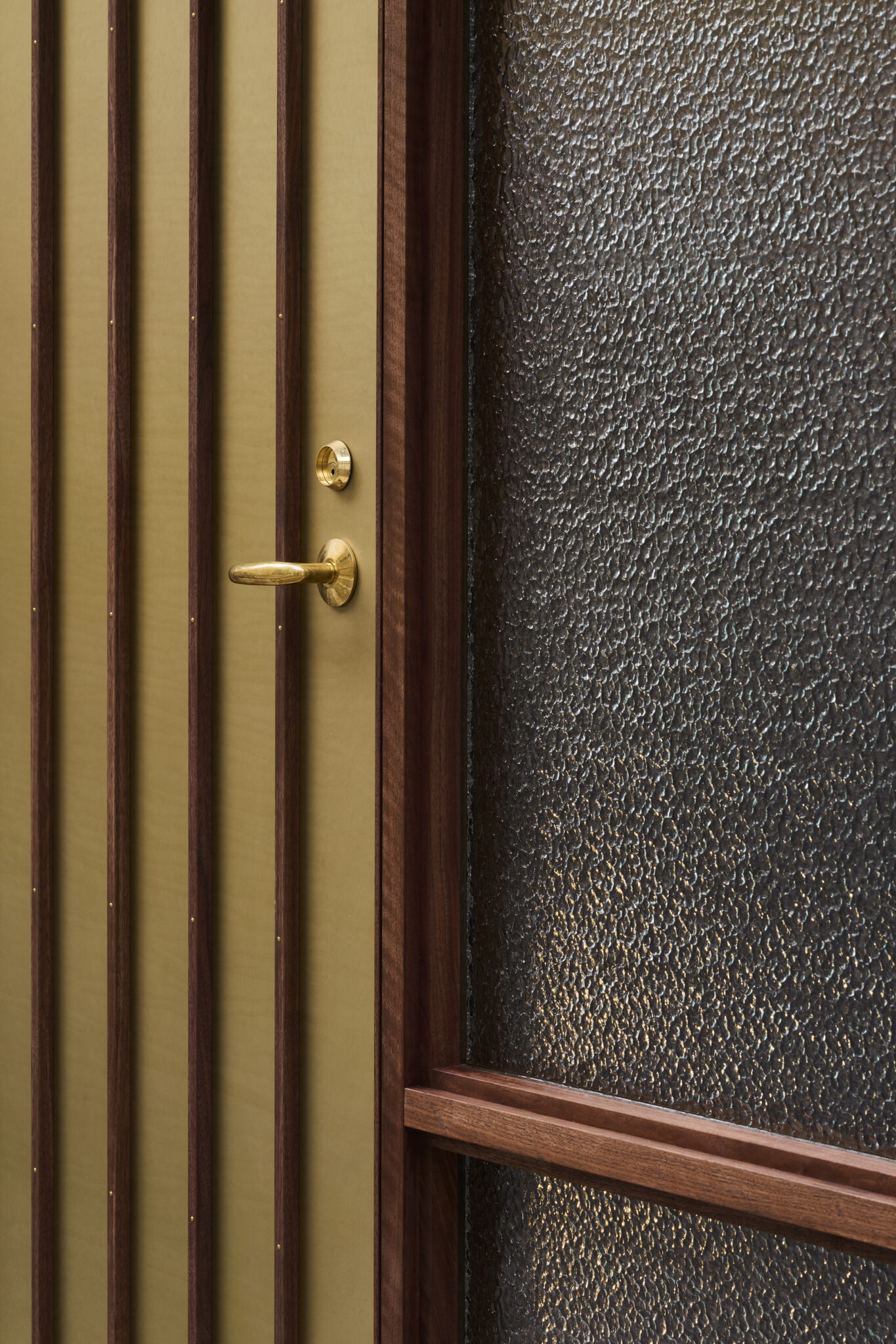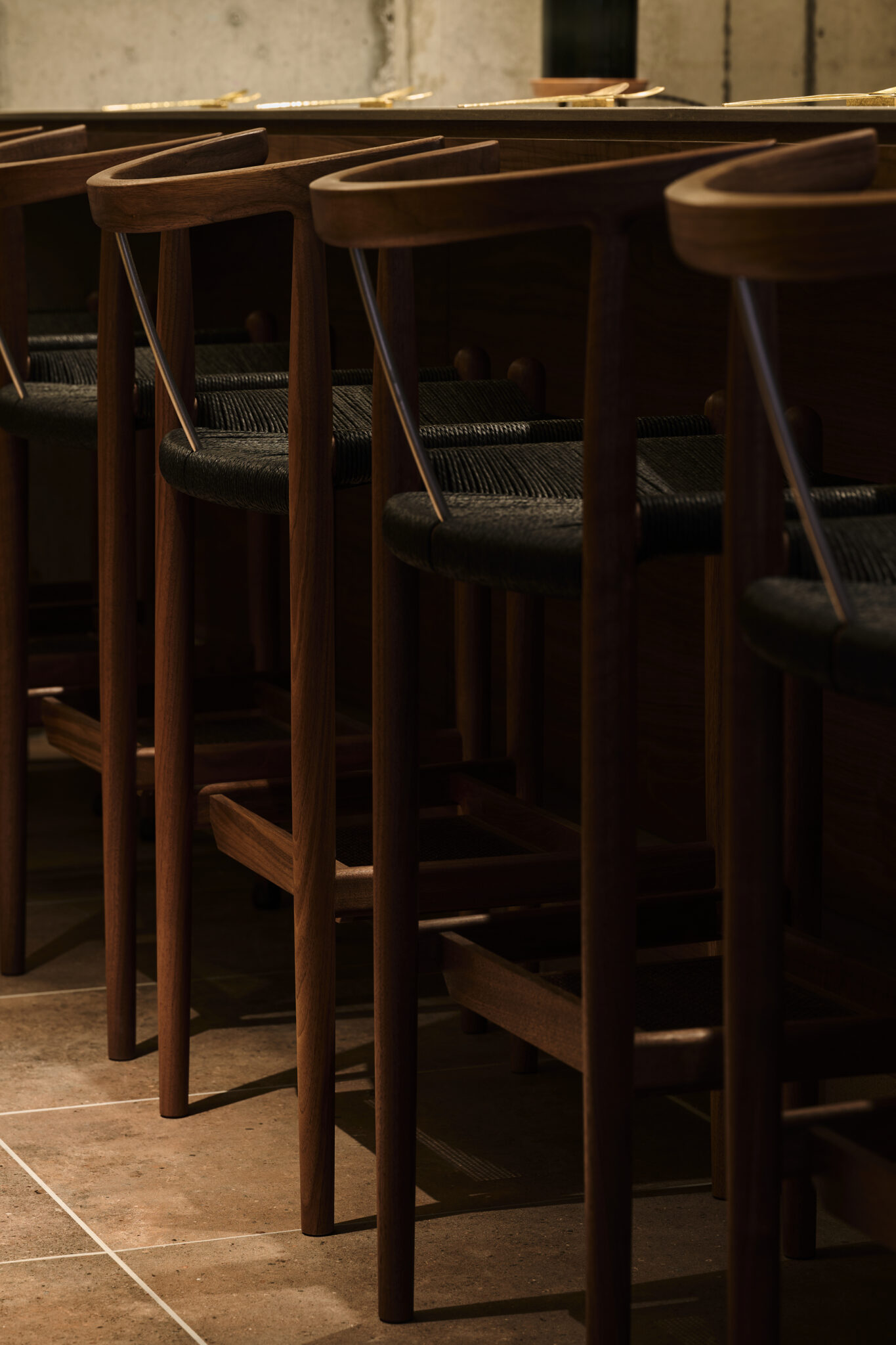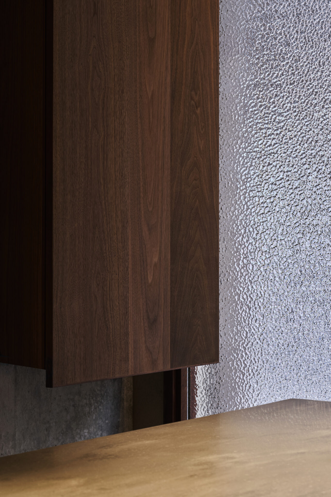 ウォルナットの木枠に嵌めたフランスの型板ガラスによって内部の光は乱反射しながら外へと拡散し、同時に、そこに映るシェフとゲストの振る舞いも動きのあるシルエットとして街に届ける。