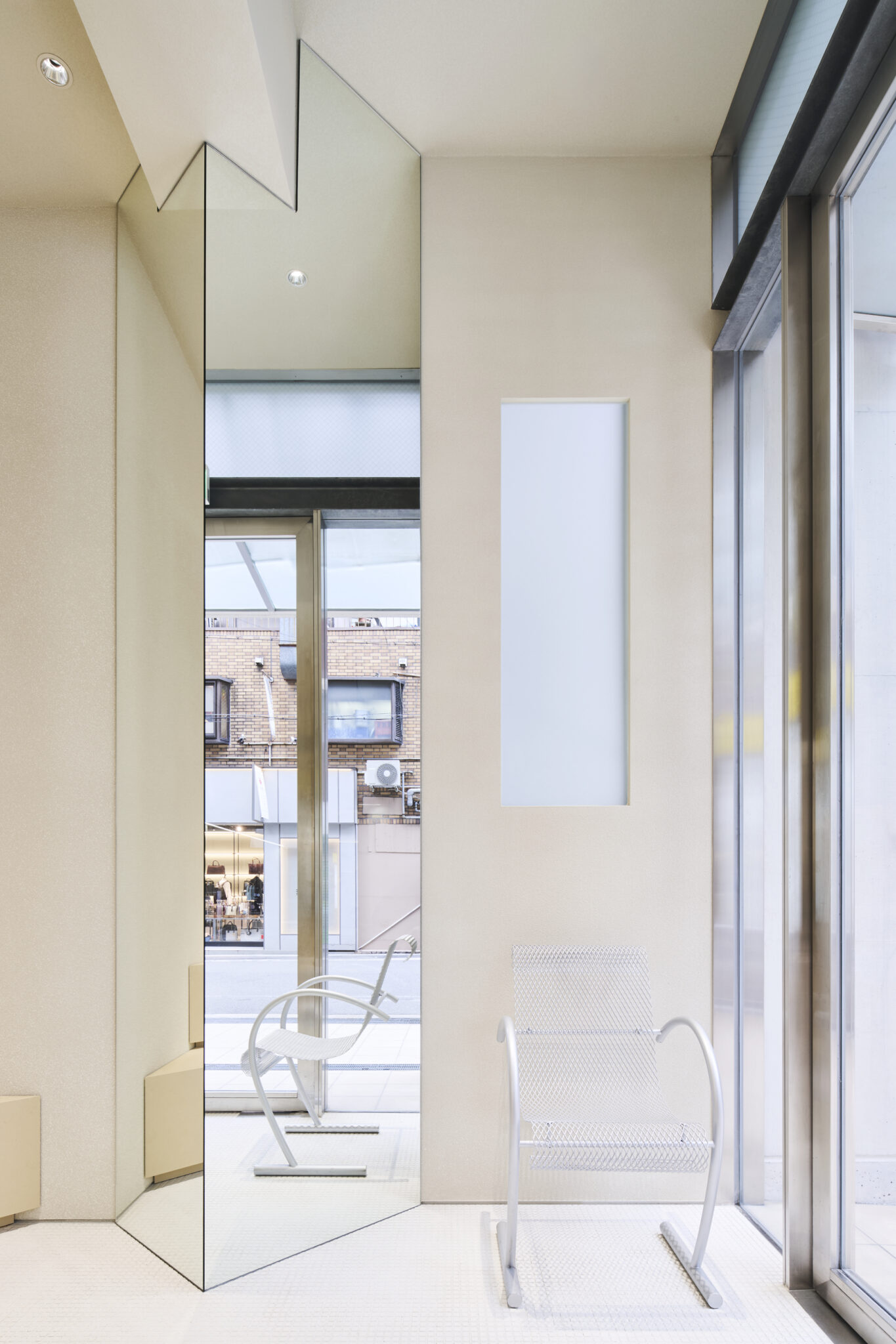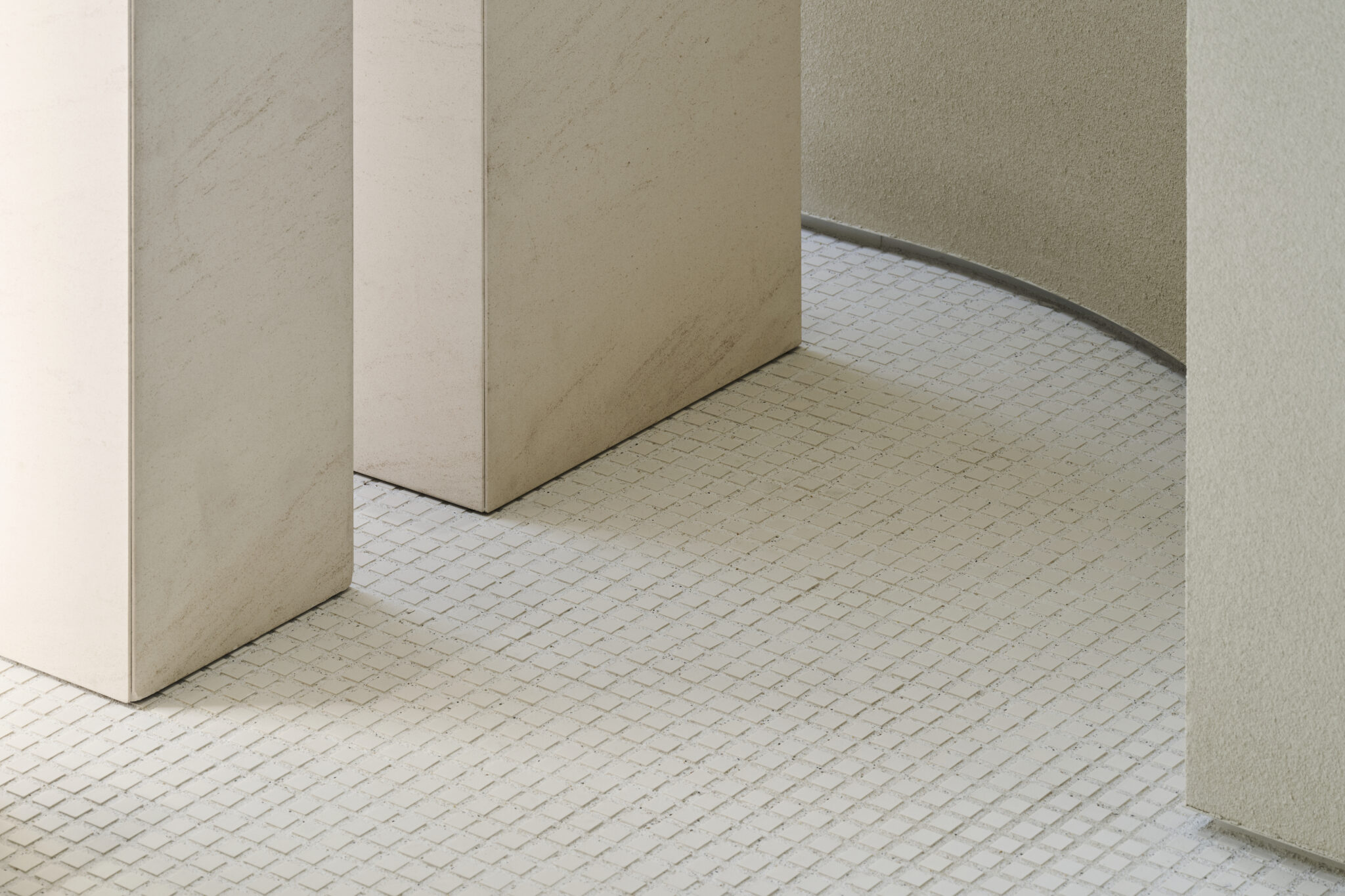 色とりどりの商品が際立つ背景となるように、床・壁・天井・什器をエクリュのワントーンとし、漆喰・モザイクタイル・和紙・石灰石・ファブリックの素材感を慎重に調律することで、1つの色の中にも確かなグラデーションを描いた。