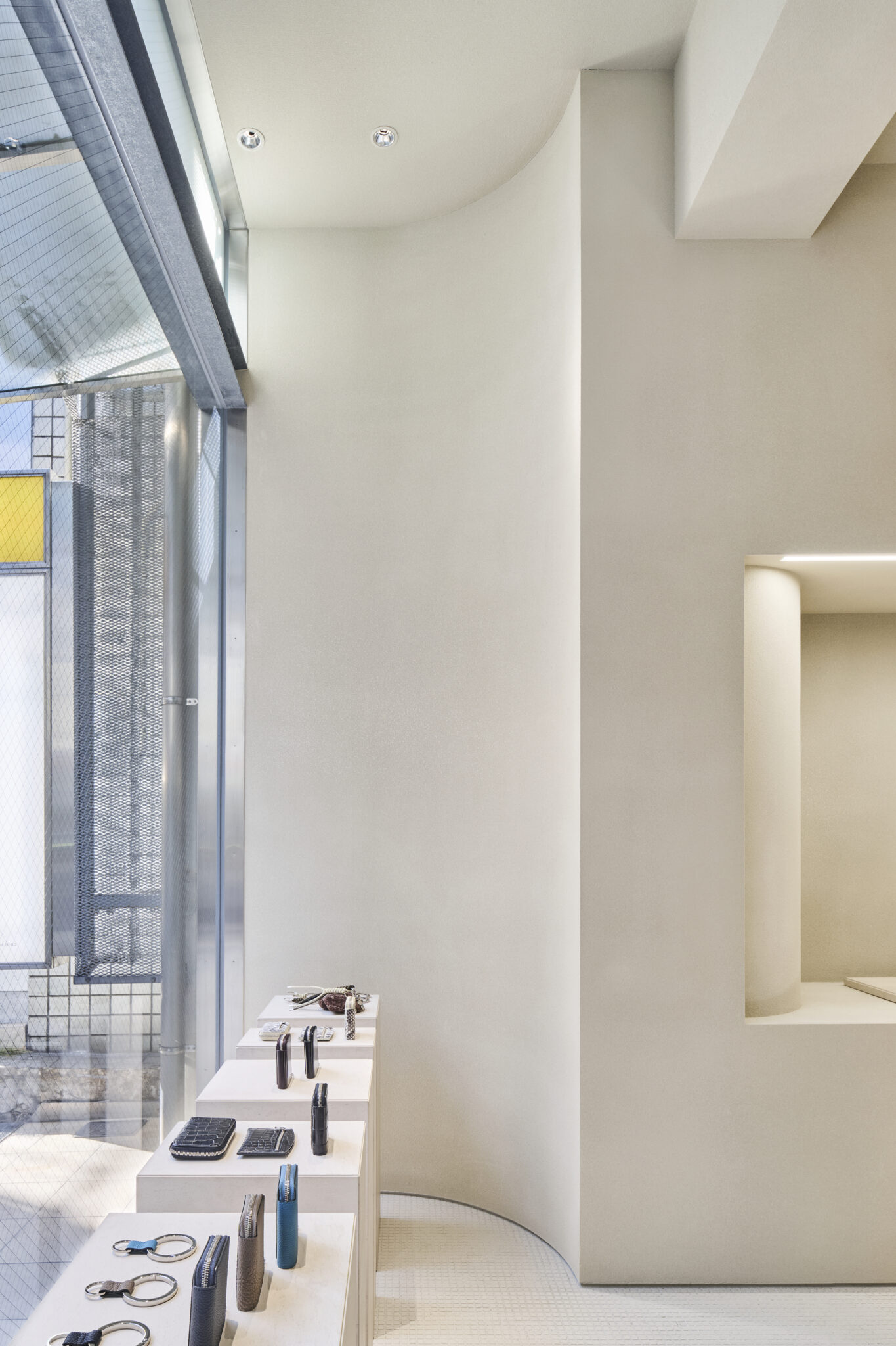 什器の形は、ニッチの中に現れる既存のRC丸柱を手掛かりに大小様々な三角柱と四角柱で構成し、幾何学と自由なフォルムを持つ商品と対比をなした。