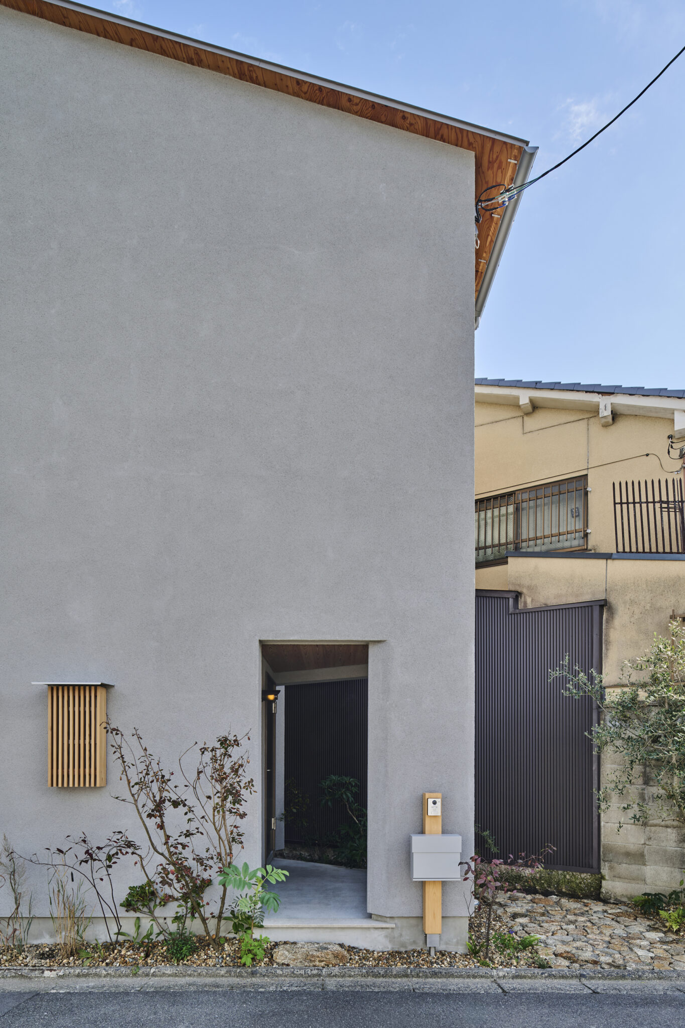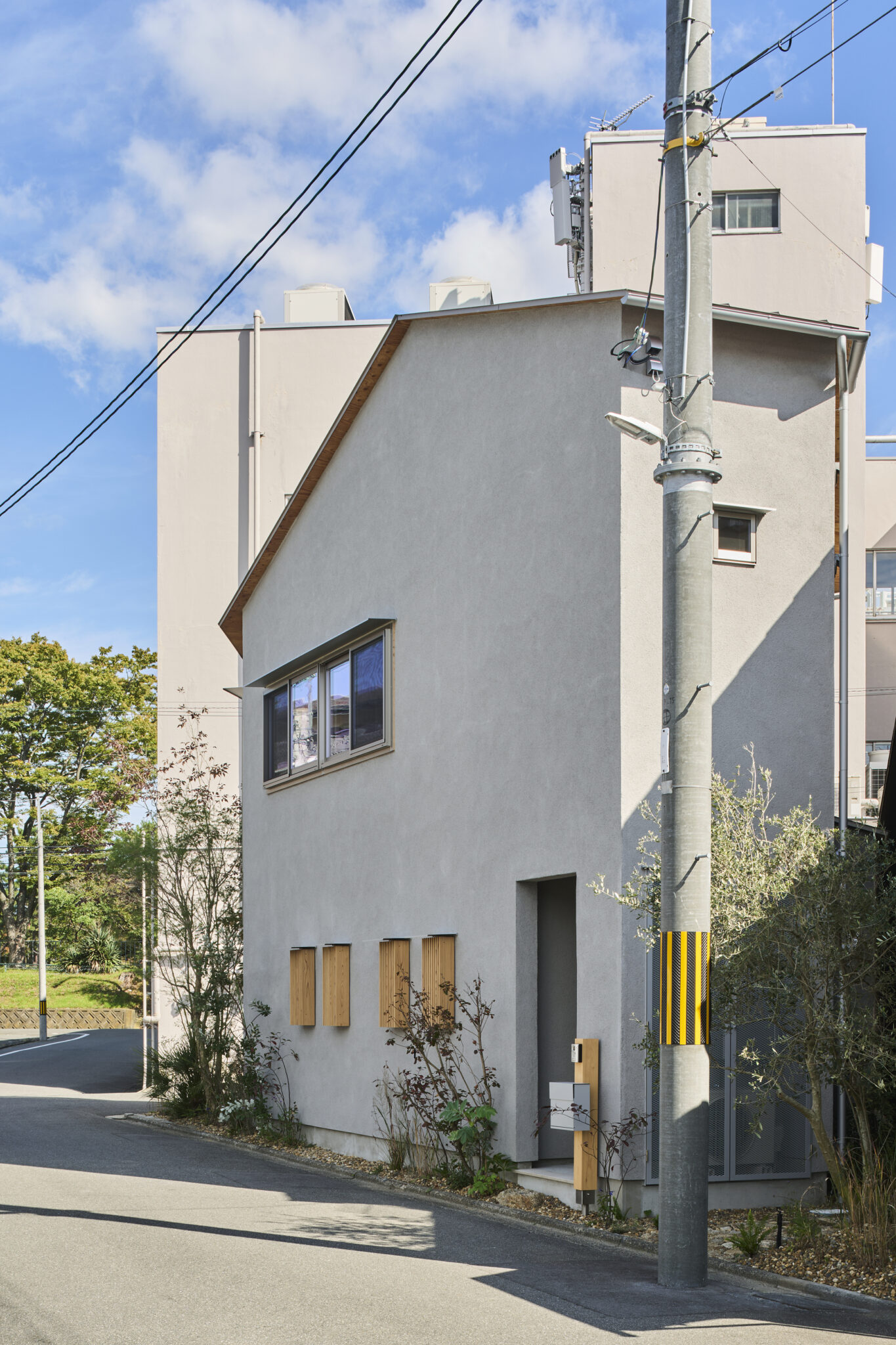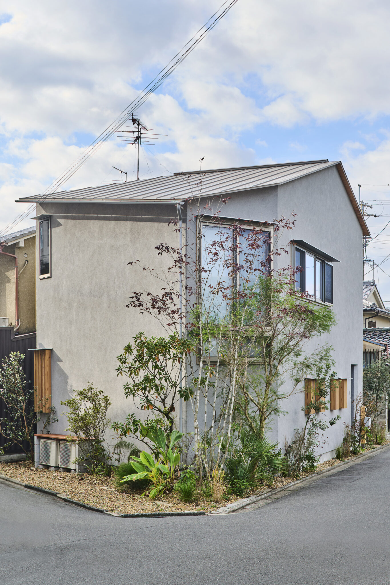 足下の切り離された残地には様々な樹木と宿根草を植えて街角に彩りを与え、歪な五角柱となって立ち上がったヴォリュームは、単純な切妻屋根を掛けるだけで見る角度によって異なる表情を見せる。