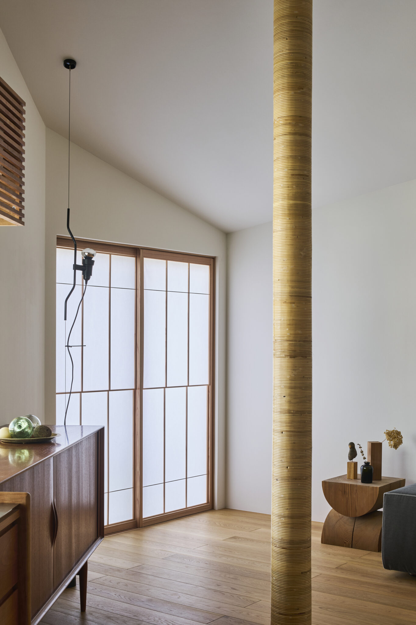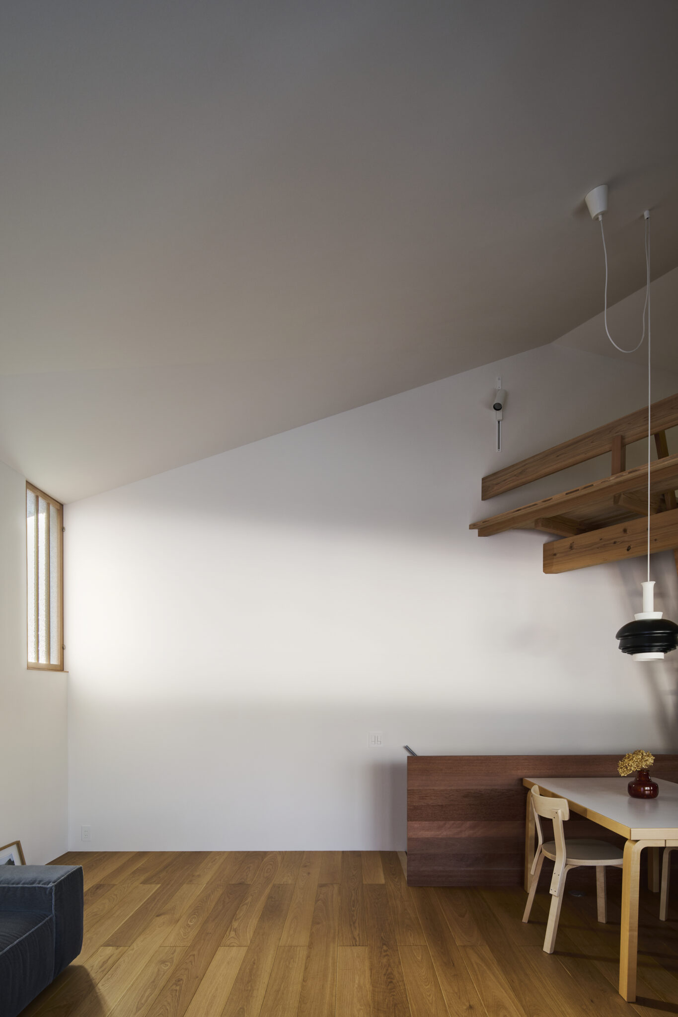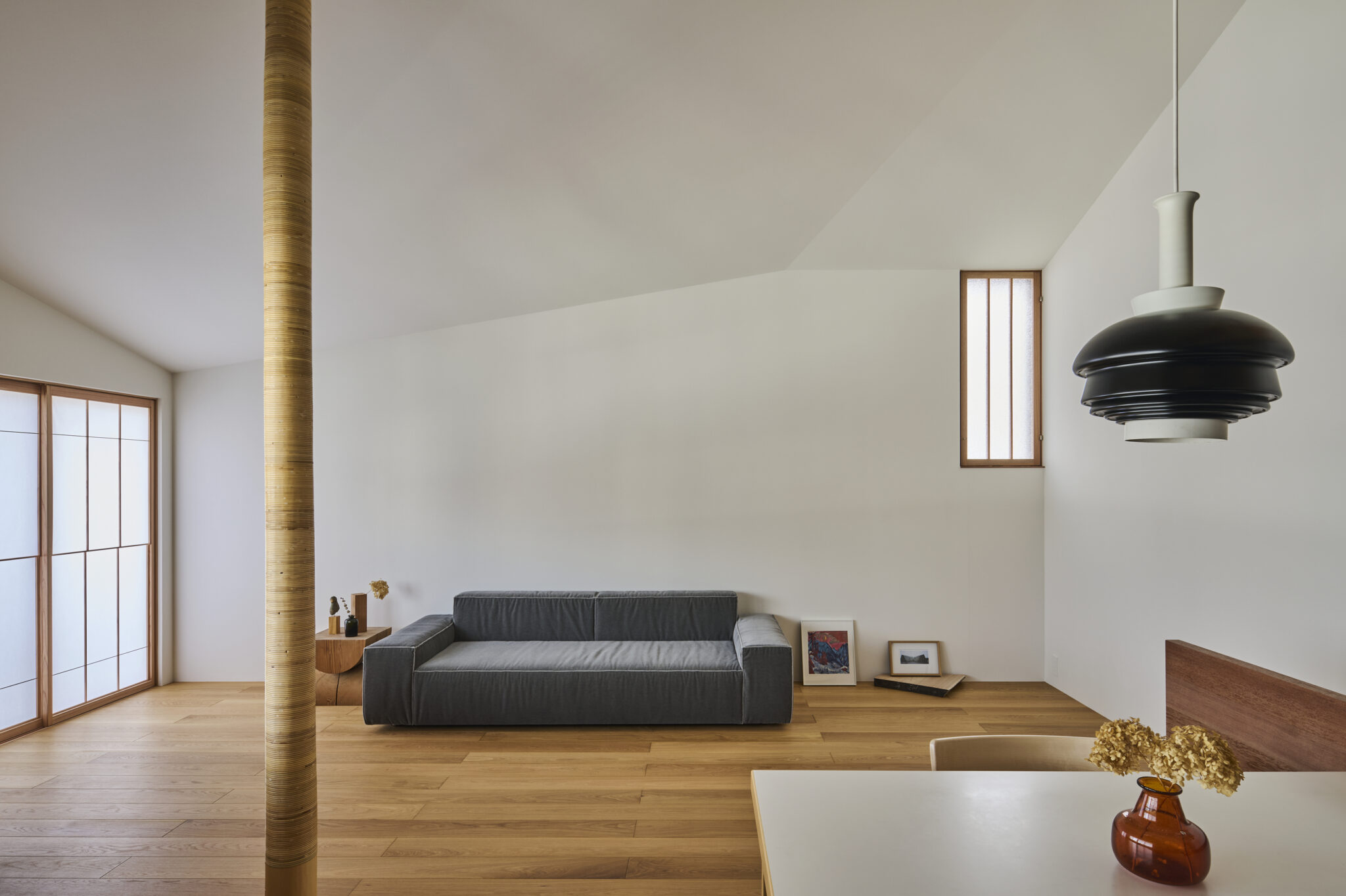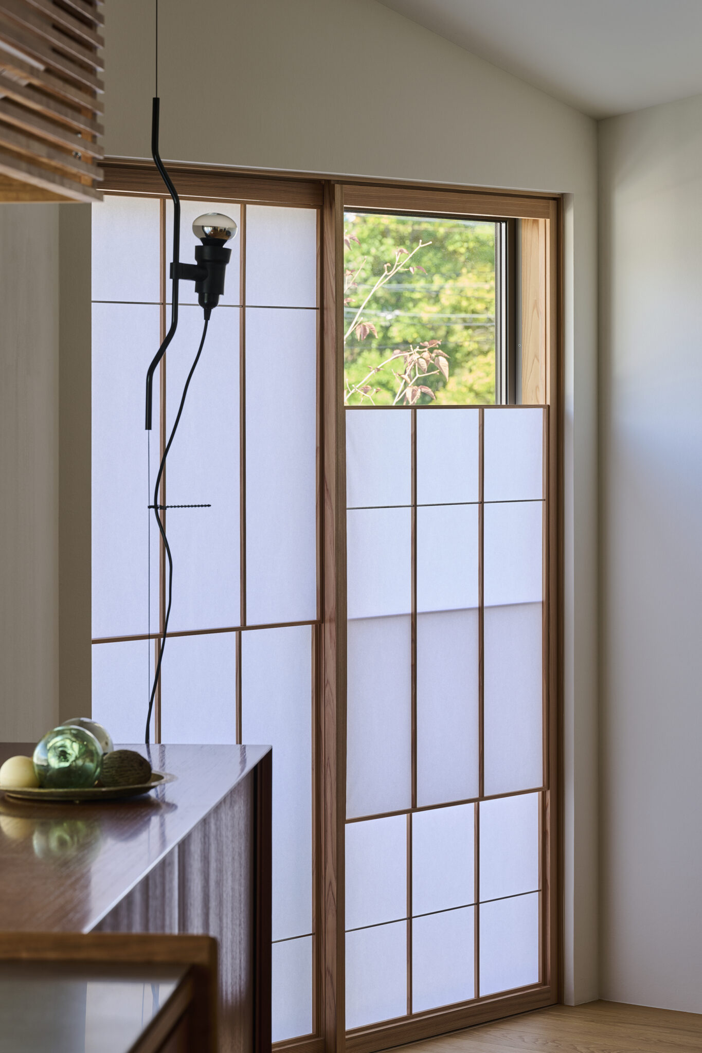 多面体に内包された2階リビングは時間に合わせてグラデーショナルな白の濃淡に変化し、周囲からのプライバシーをチューニングする障子と型板ガラスからは季節ごとに瞬刻の光のギフトを届けてくれる。