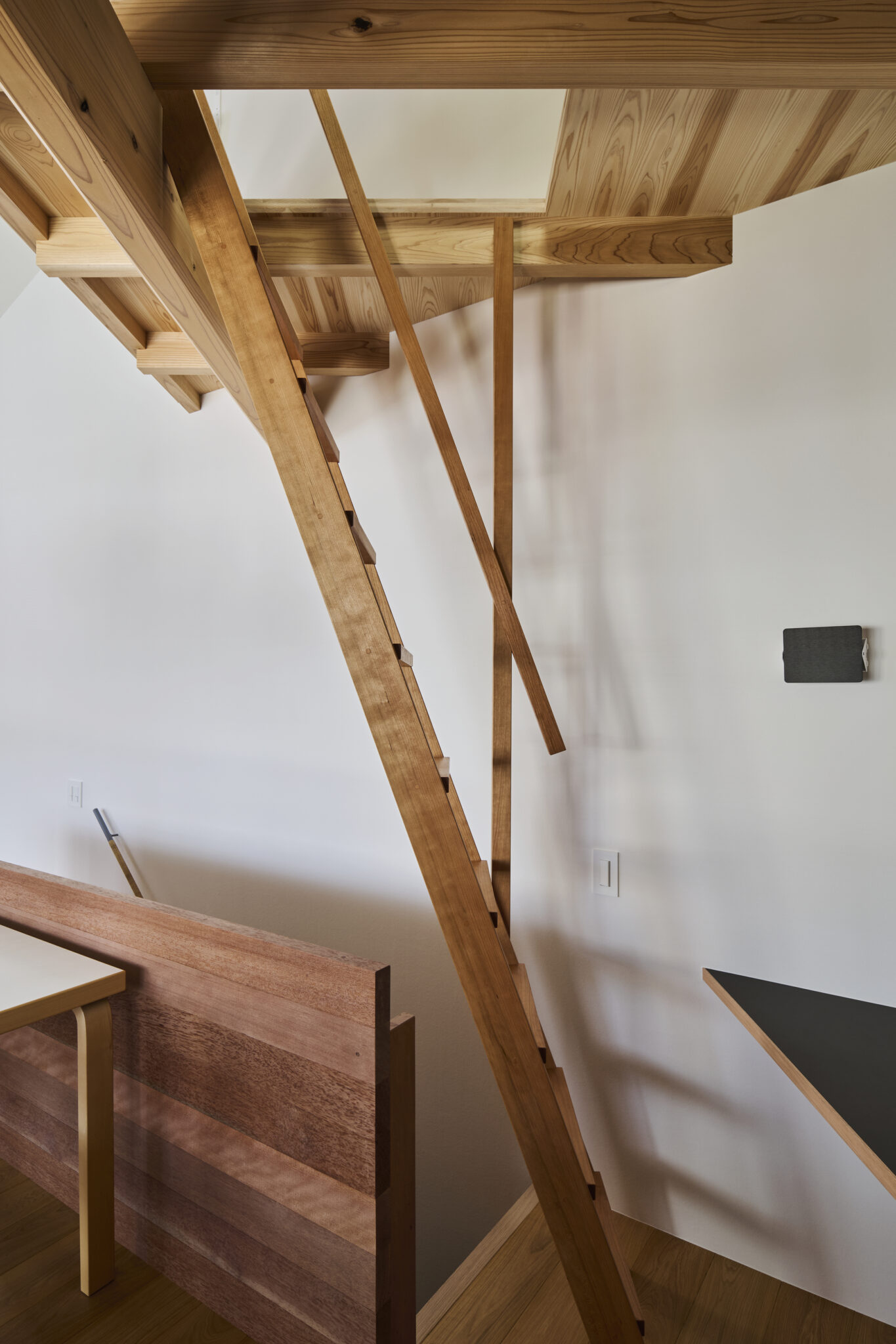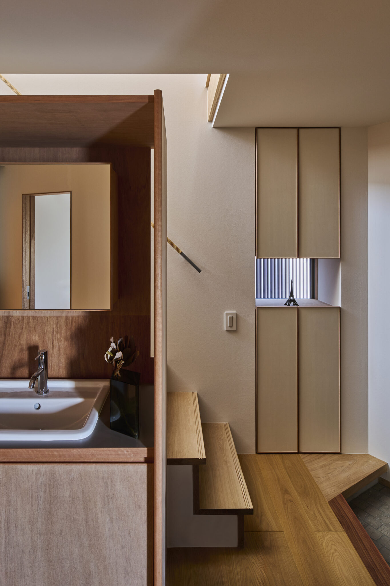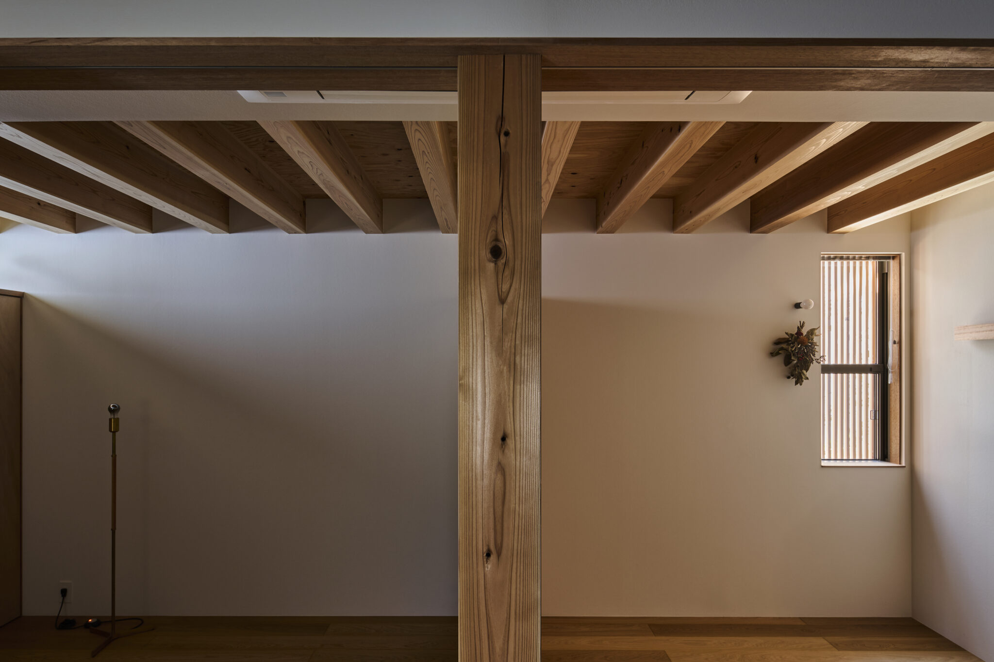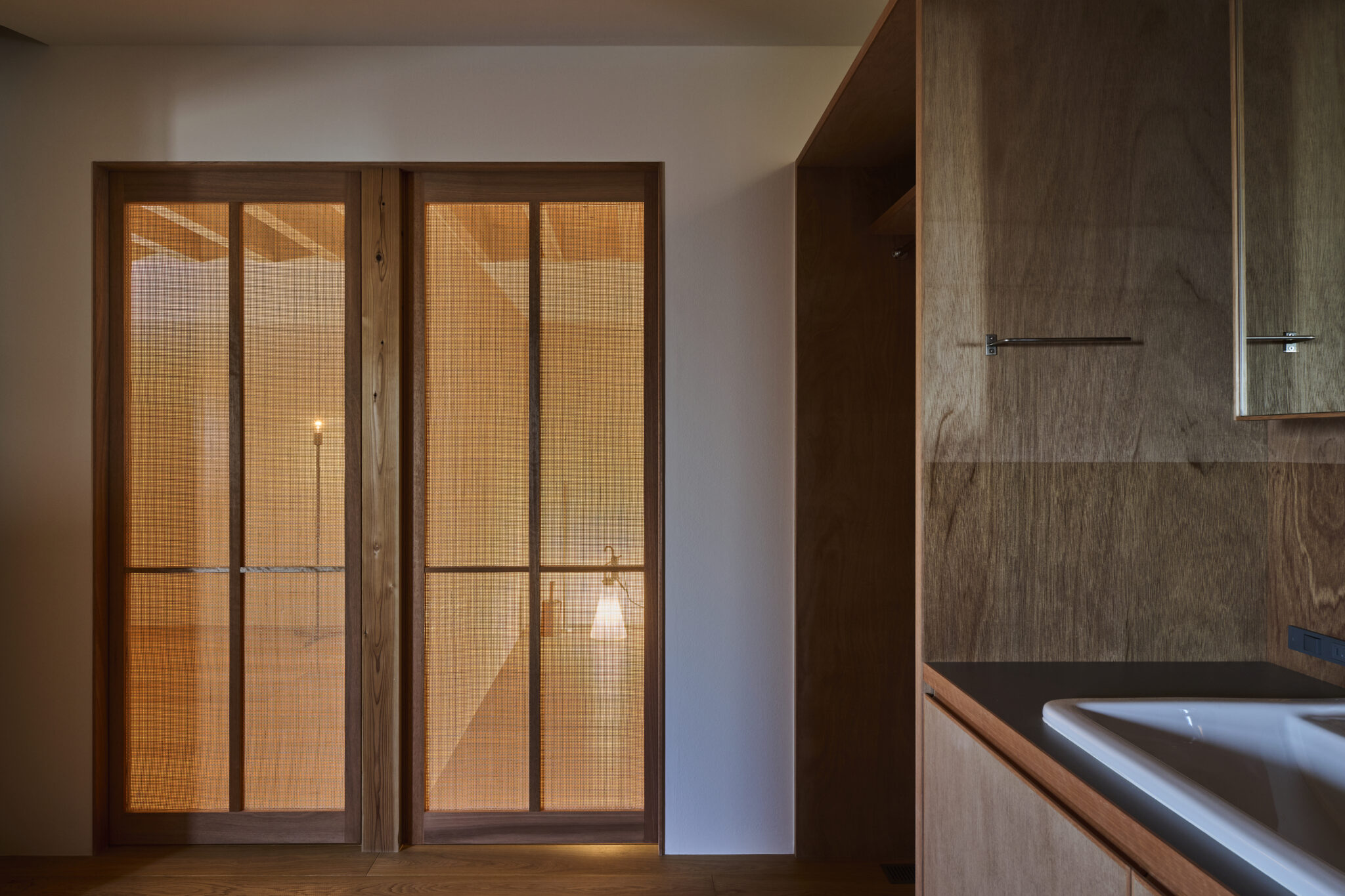 多面体に内包された2階リビングは時間に合わせてグラデーショナルな白の濃淡に変化し、周囲からのプライバシーをチューニングする障子と型板ガラスからは季節ごとに瞬刻の光のギフトを届けてくれる。
