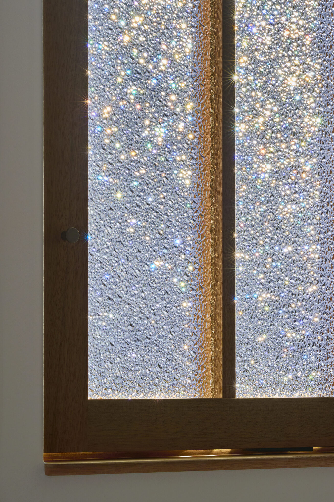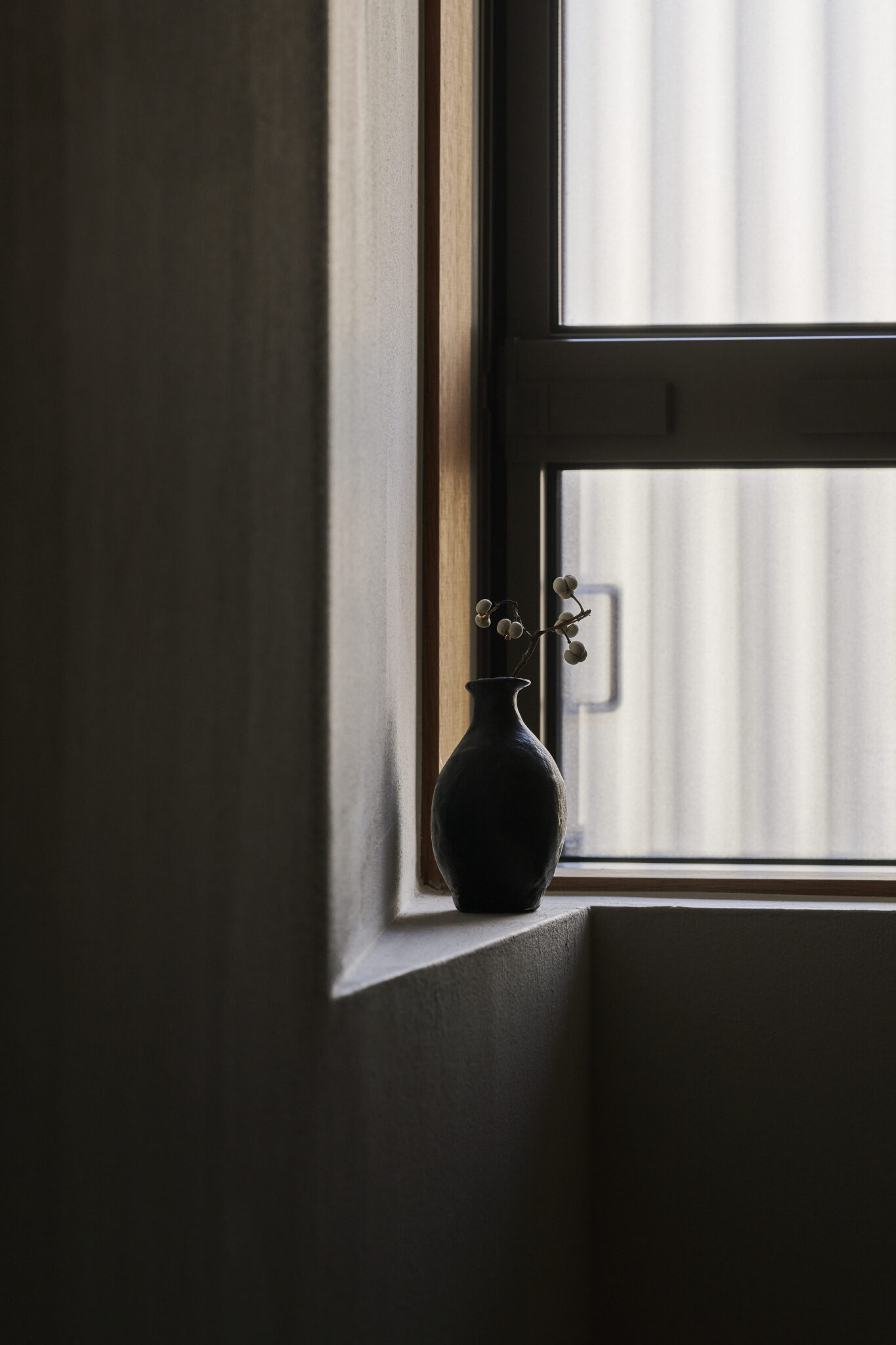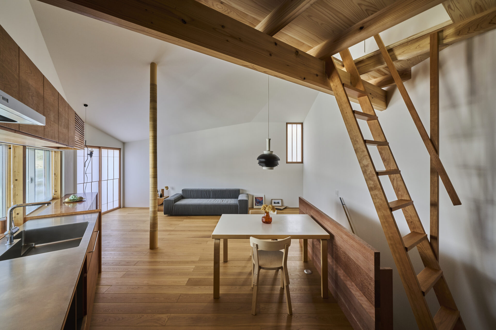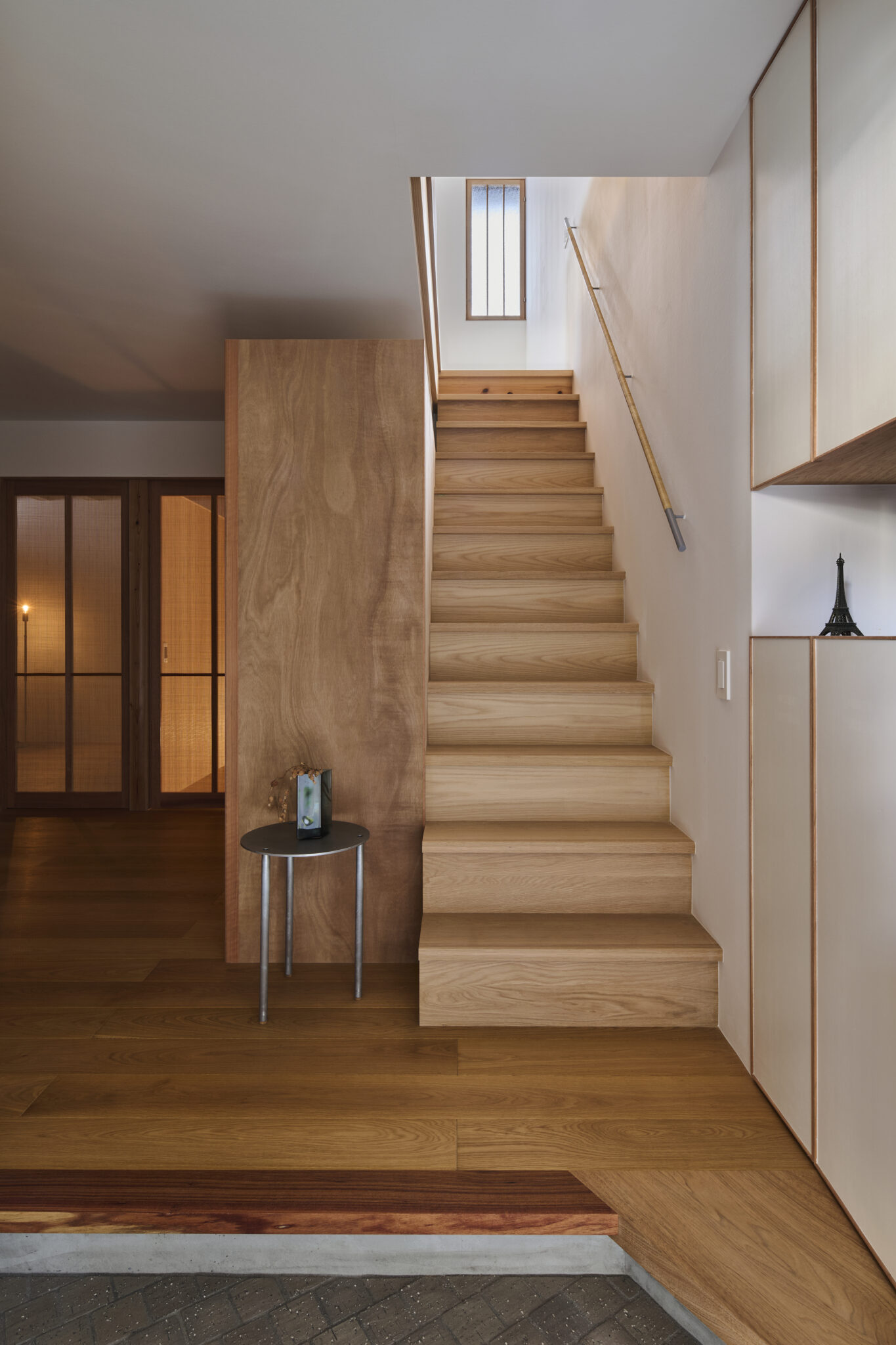 多面体に内包された2階リビングは時間に合わせてグラデーショナルな白の濃淡に変化し、周囲からのプライバシーをチューニングする障子と型板ガラスからは季節ごとに瞬刻の光のギフトを届けてくれる。