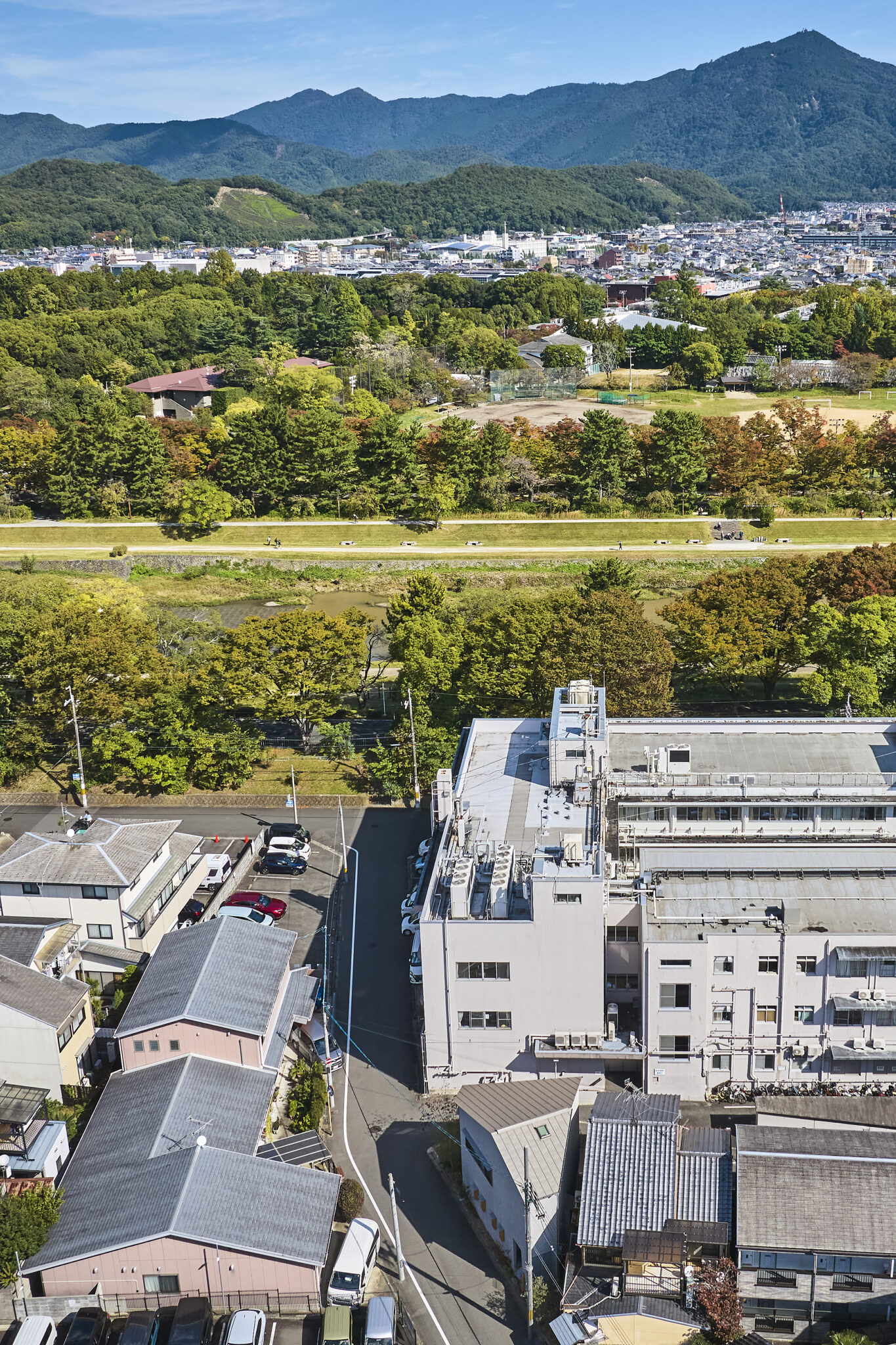 まず初めに敷地をトレースしてできる三角形のフットプリントの2隅を直角三角形に切り落として五角形に整え、賀茂川に面する1辺には窓を穿ち桜並木を借景とした。